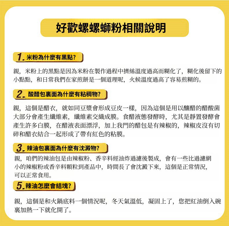 好歡螺螺螄粉相關說明1.米粉為什麼有黑點?親,米粉上的黑點是因為米粉在製作過程中擠絲溫度過高而糊化了,糊化後留下的小點點...